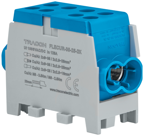 Złączka kompaktowa na szynę, niebieska 1×35+1×25mm2/1×35+1×25mm2, 400VAC, 125A FLE-35/25K Tracon Electric