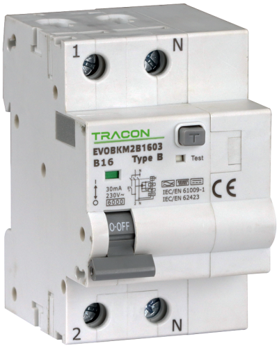 Wyłącznik różnicowoprądowy zczł. nadprąd., B, 2P, 3-mod. B16A, 30 mA, 6kA, B EVOBKM2B1603 Tracon Electric