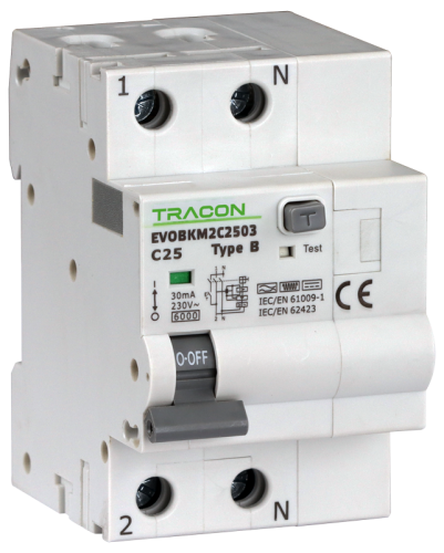 Wyłącznik różnicowoprądowy zczł. nadprąd., B, 2P, 3-mod. B25A, 30 mA, 6kA, B EVOBKM2B2503 Tracon Electric