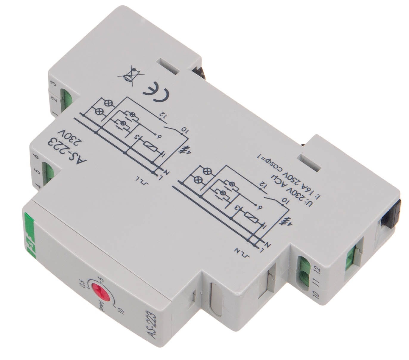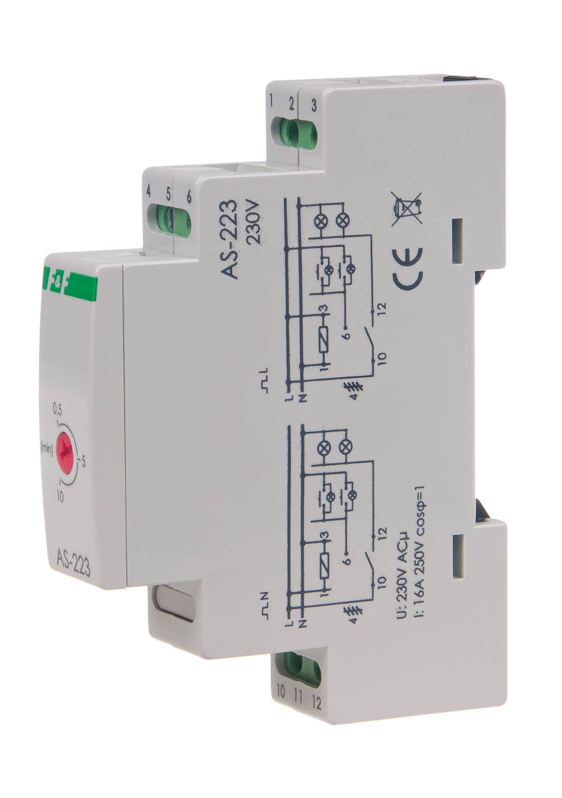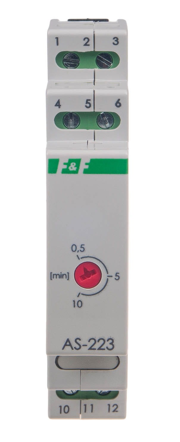 AS-223 to elektroniczny automat schodowy firmy F&F, przeznaczony do czasowego utrzymywania włączonego oświetlenia na korytarzach i klatkach schodowych. Jest montowany w rozdzielnicy na szynie DIN 35 mm (zajmuje 1 moduł) i wyróżnia się kluczową funkcją przeciwblokady, która zapobiega ciągłemu świeceniu w przypadku zablokowania przycisku.