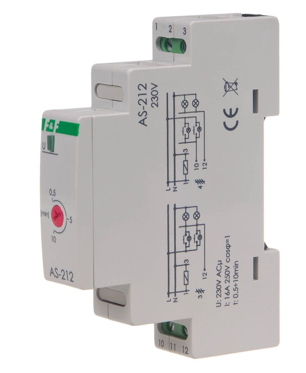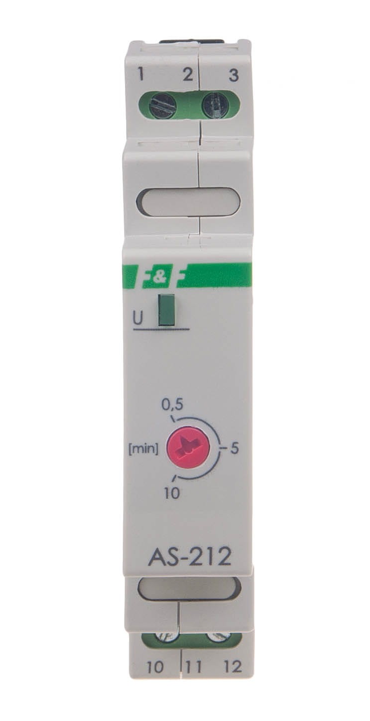 AS-212 to elektroniczny automat schodowy firmy F&F przeznaczony do czasowego załączania oświetlenia w korytarzach, klatkach schodowych lub innych pomieszczeniach, montowany bezpośrednio w rozdzielni na szynie DIN 35 mm.