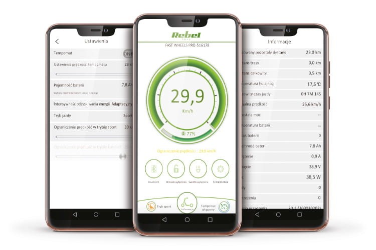 Do hulajnogi Fast Wheels PRO powstała dedykowana aplikacja REBEL Fastwheels PRO, która zawiera w sobie szereg przydatnych funkcji. Dzięki niej nie tylko sprawdzisz aktualną prędkość, ale możesz także wprowadzić jej ograniczenie lub ustawić tempomat. Dodatkowo aplikacja obliczy Ci szacowany dystans, jaki przejedziesz na baterii.