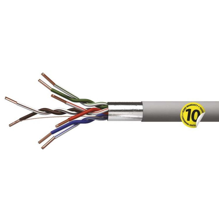 Ekranowany przewód do okablowania poziomego o najwyższej jakości kategorii CAT5E z płaszczem PCV. Żyły przewodu zostały wykonane z miedzi wolnej od recyklingu. Przewód spełnia wymagania dyrektywy CPT o wyrobach budowlanych.