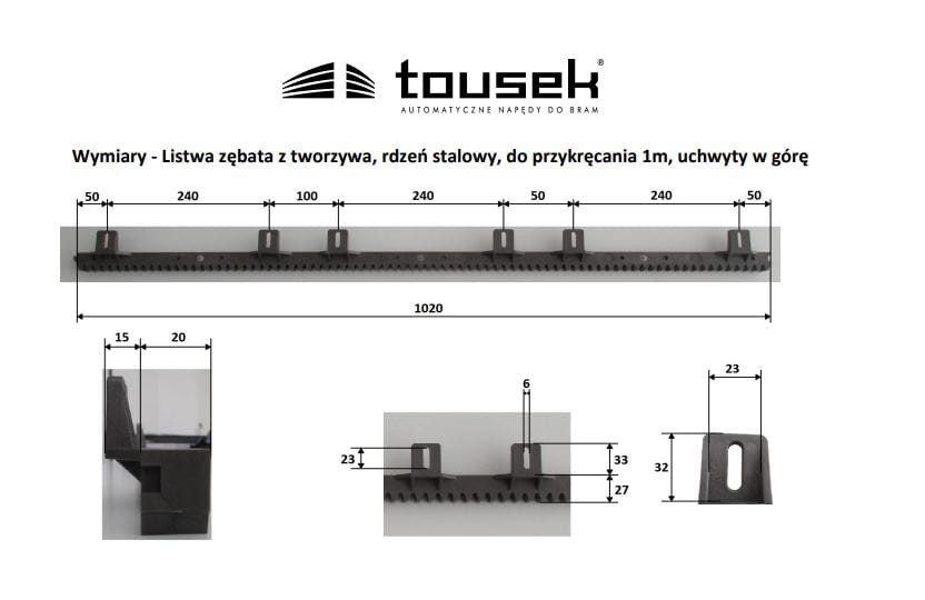 Listwa zębata Tousek 14220010 z Tworzywa z Metalowym Rdzeniem górna do przykręcania opakowanie 1MB 1x1MB bez spawania rdzeń stalowy mocowanie uchwyt górny od góry do bram przesuwnych