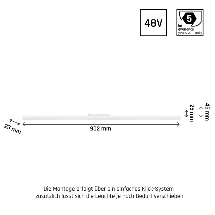 Oprawa oświetleniowa na szynoprzewód SYSTEM SHIFT - LINE L, o mocy 22 W, wysokiej skuteczności świetlnej 105 lm/W. Jest ona elementem SYSTEMu SHIFT, nowoczesnego i minimalistycznego systemu oświetlenia, zbudowanego na wąskim szynoprzewodzie zasilanym bezpiecznym napięciem 48V, który pozwala na dowolne rozmieszczenie lamp w obrębie szyny. Wykonana jest z komponentów o wysokiej jakości, potwierdzonej 5 letnią gwarancją. Wyróżnia się także bardzo wysokim wskaźnikiem oddawania barw RA>90. Świeci światłem o ciepłej barwie (3000K), które sprzyja relaksowaniu się i odpoczynkowi, sprawiając że oświetlane pomieszczenie jest bardziej przytulne. Przeznaczona do montażu na szynoprzewód.