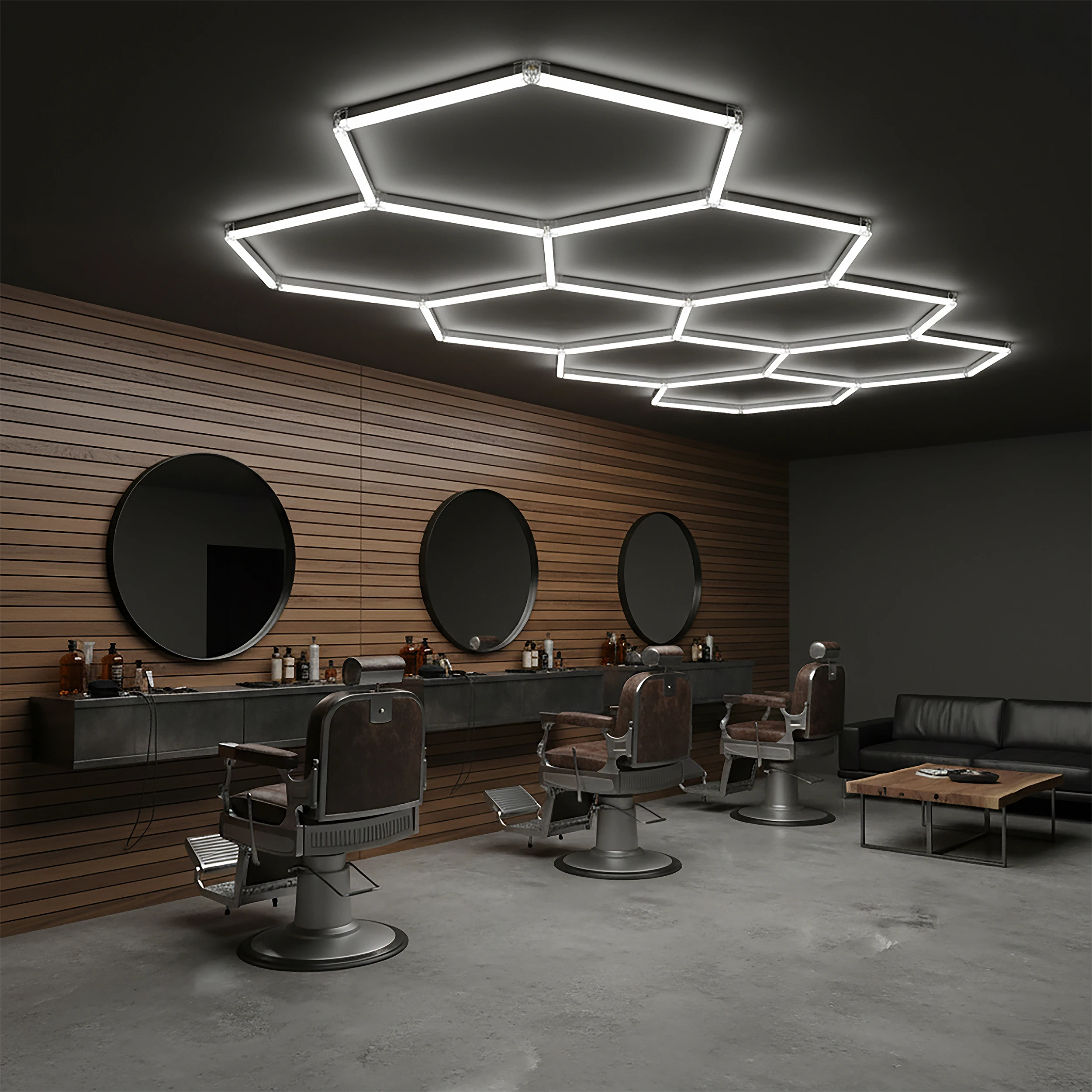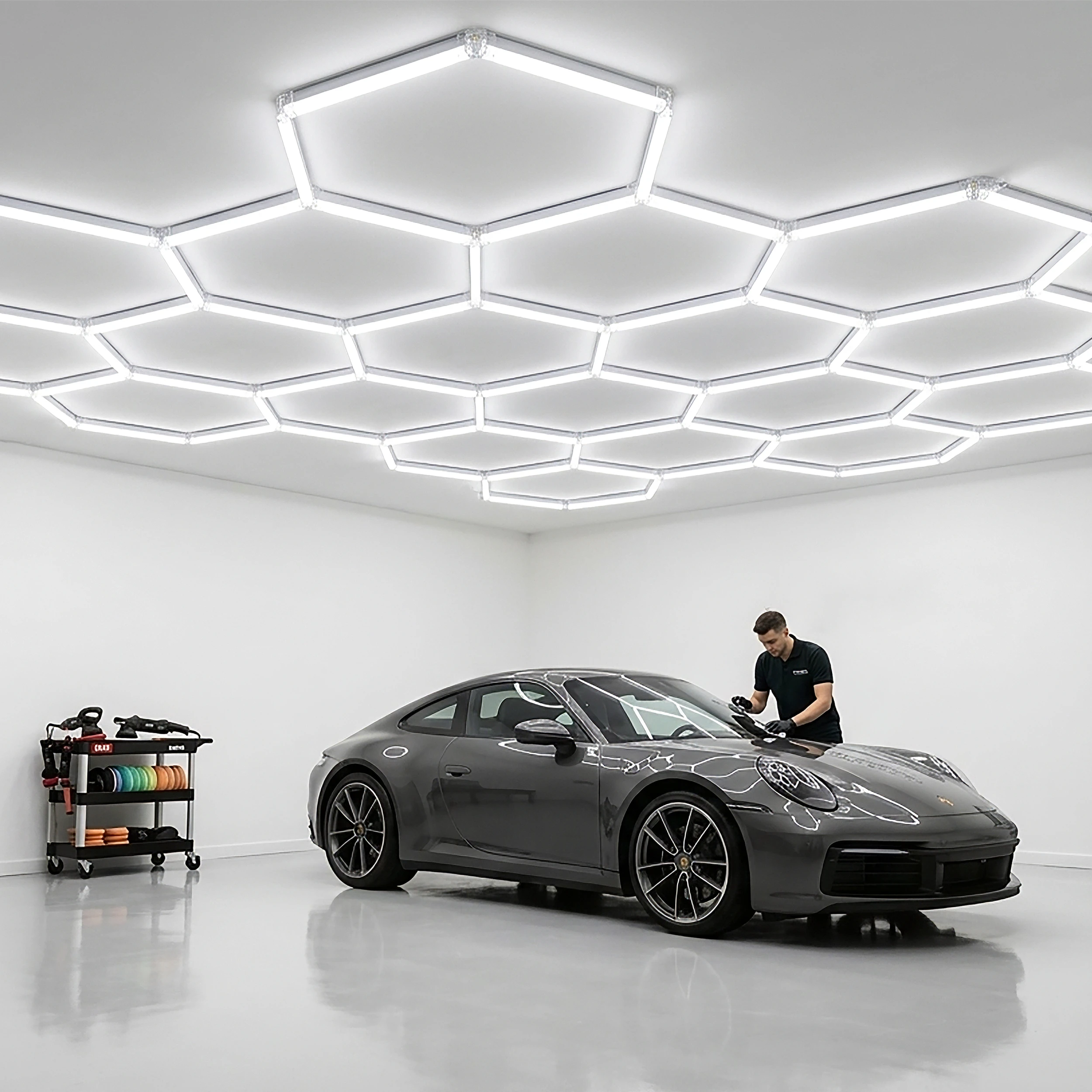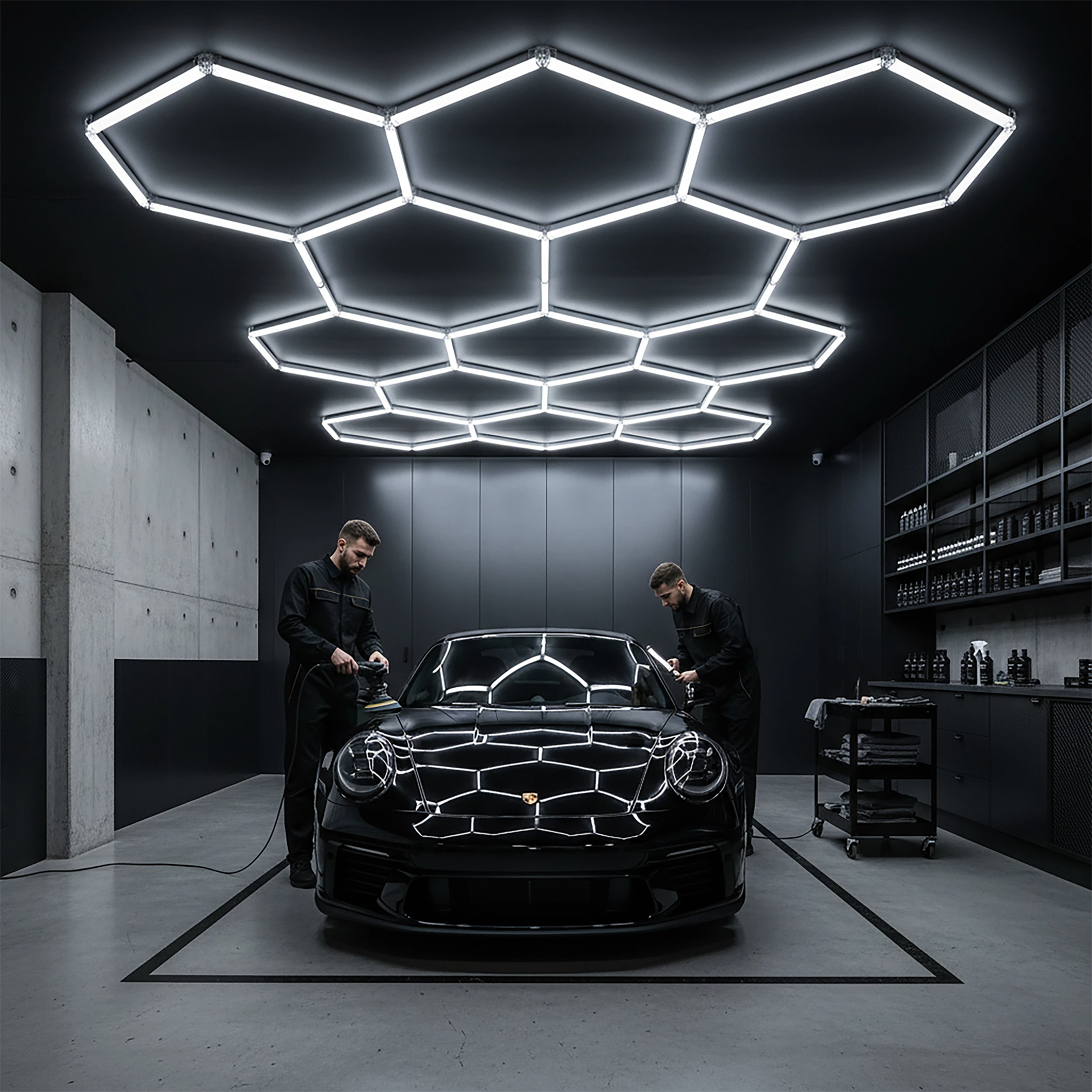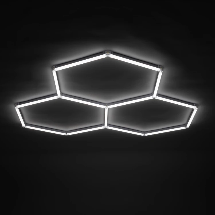 Nowoczesna lampa sufitowa LED o geometrycznej, sześciokątnej konstrukcji to funkcjonalne rozwiązanie stworzone z myślą o przestrzeniach roboczych i technicznych. Jej charakterystyczna, sześciokątna konstrukcja inspirowana strukturą plastra miodu nie tylko wyróżnia się wizualnie, ale przede wszystkim zapewnia równomierne i szerokie rozproszenie światła, co jest kluczowe podczas prac wymagających precyzji i doskonałej widoczności. Wykonana z metalu i tworzywa sztucznego gwarantuje trwałość oraz odporność na intensywne użytkowanie, a uniwersalna biała kolorystyka podkreśla profesjonalny charakter lampy. Zintegrowane źródło światła LED o zimnej barwie 6500K emituje jasne, wyraźne światło o strumieniu 840 lumenów, idealne do oświetlenia stanowisk pracy, powierzchni roboczych oraz detali pojazdów. Szeroki kąt świecenia 180° skutecznie eliminuje cienie i poprawia komfort pracy. Lampa posiada stopień ochrony IP44, co zapewnia odporność na wilgoć i pył, a II klasa ochronności zwiększa bezpieczeństwo użytkowania. Zasilanie 230V / 50Hz, maksymalna moc 42W, współczynnik oddawania barw CRI powyżej 80 oraz żywotność na poziomie 20 000 godzin sprawiają, że HONEY COMB to niezawodne i wydajne rozwiązanie dla profesjonalistów oraz wymagających użytkowników, którzy potrzebują mocnego, równomiernego światła w swojej przestrzeni pracy.