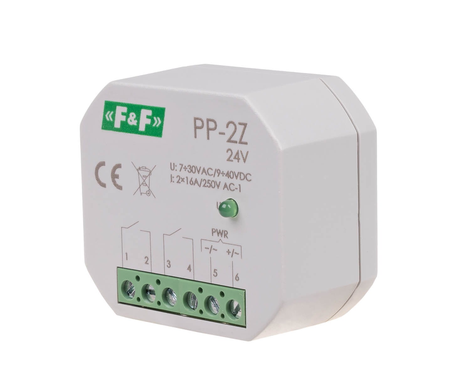Przekaźnik elektromagnetyczny, 2Z 16A, montaż podtynkowy, w obud. PDT, U=7÷30VAC / 9÷40VDC PP-2Z-24V F&F