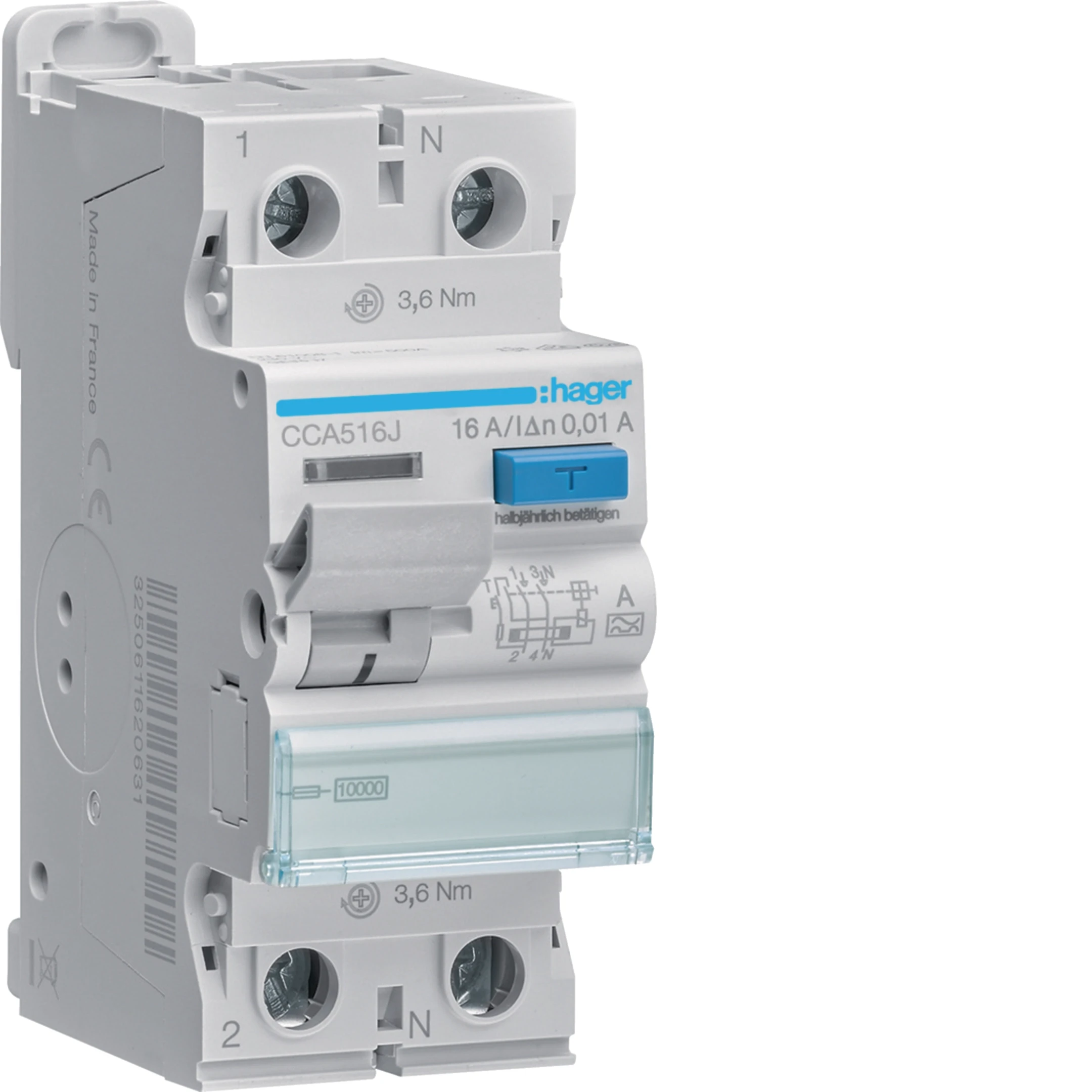 RCCB Wyłącznik różnicowoprądowy 1P+N 16A 10mA 10kA A CCA516J Hager