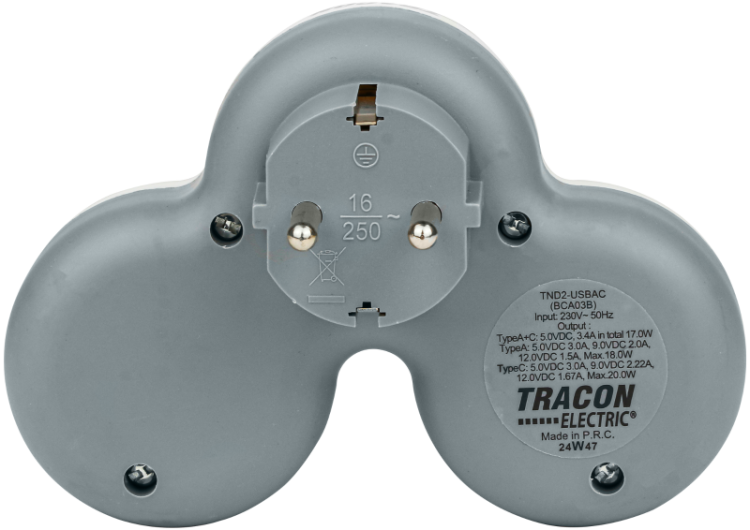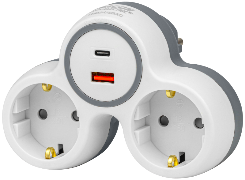 Rozgałęźnik wielogniazdowy SCHUKO, USBC+USBA, szary + biały 2×SCHUKO, max.16A, 230VAC, 3680W, PP, USB-A+C:5V, 3,4A 17.0W TND2-USBAC Tracon Electric