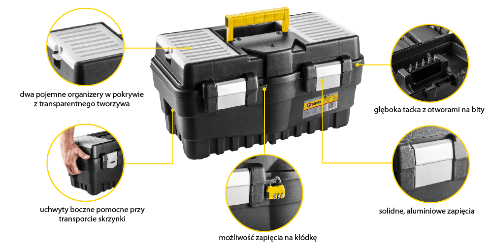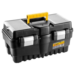 Skrzynka narzędziowa TOPEX to praktyczny i solidny pojemnik na narzędziowa, wykonany z wytrzymałego tworzywa sztucznego z aluminiowym zapięciem. Skrzynka posiada 2 organizery do przechowywania drobnych elementów, tackę wewnątrz i wygodny uchwyt do przenoszenia. Pomocne są także boczne uchwyty.