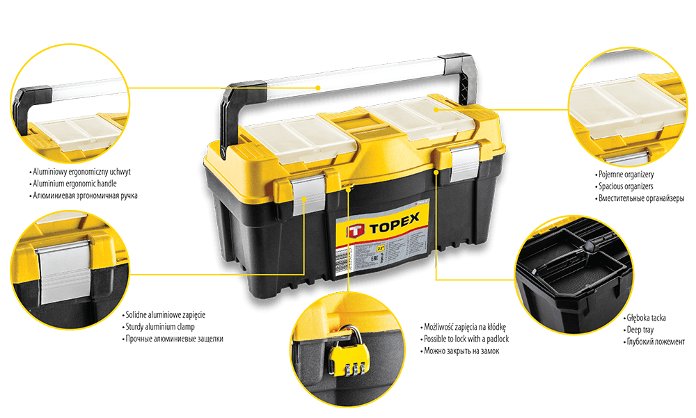 Skrzynka narzędziowa TOPEX to lekka i praktyczna skrzynka narzędziowa wykonana z odpornego tworzywa sztucznego. Posiada 2 praktyczne organizery do przechowywania drobnych elementów i aluminiowe klamry. Z solidnym aluminiowym uchwytem do przenoszenia.