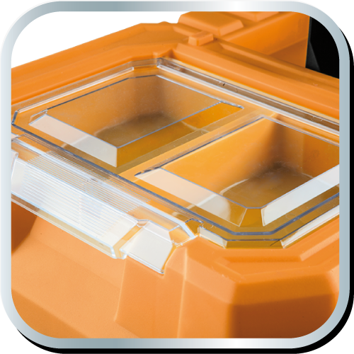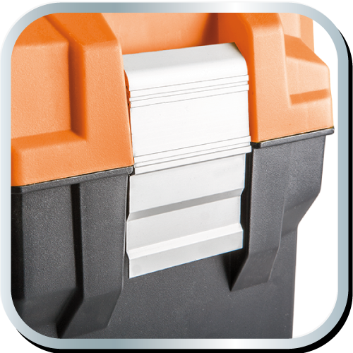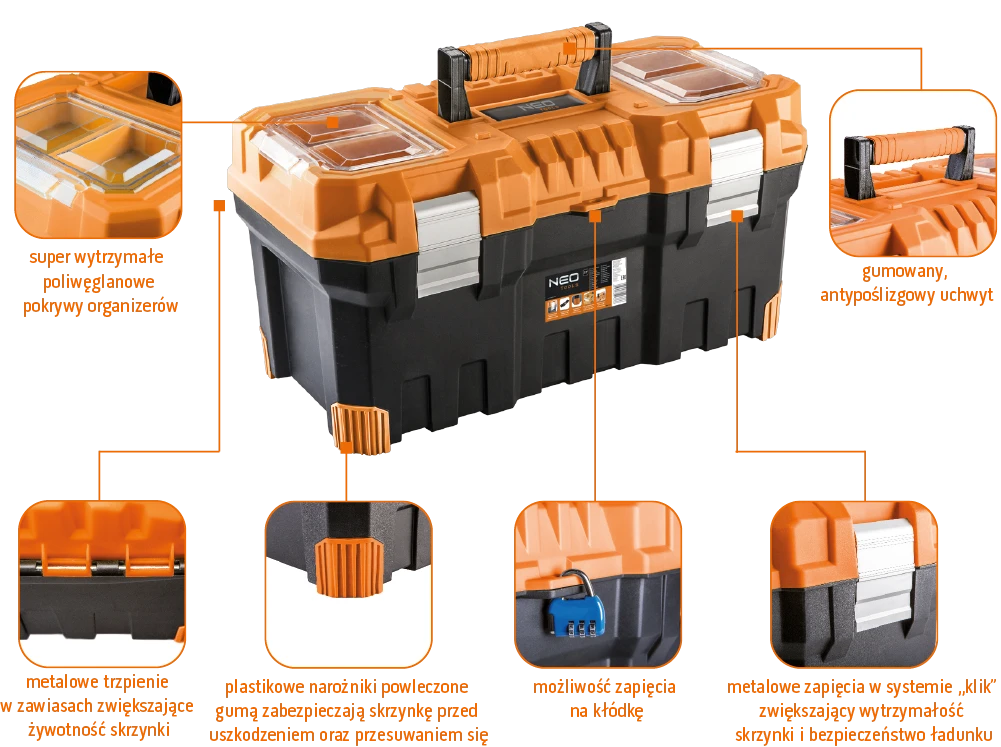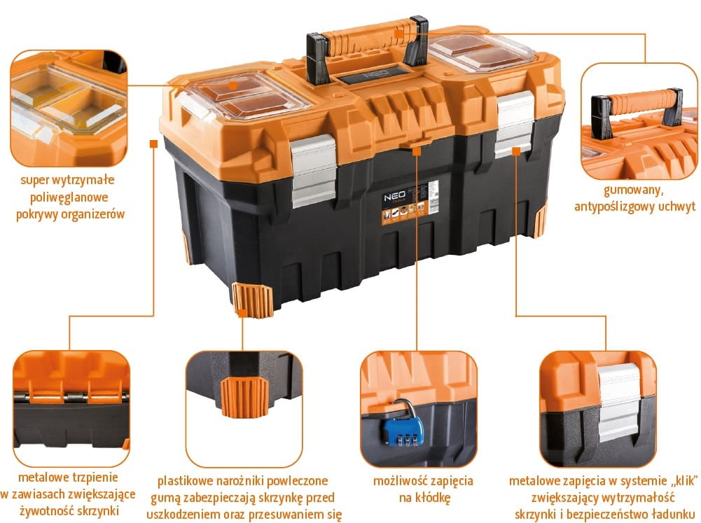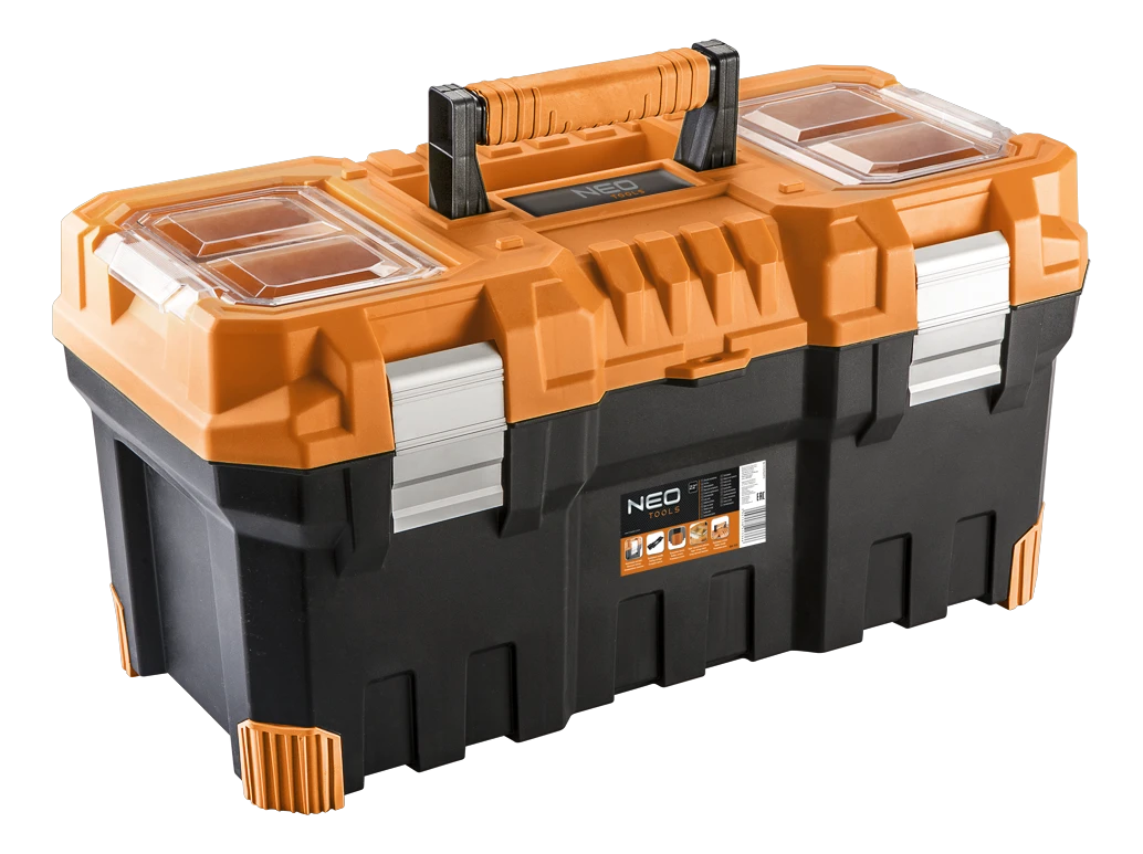 Skrzynka narzędziowa 22" NEO (nr ref. 84-113) o wymiarach 55.4 x 28.6 x 27.6 cm, antypoślizgowy uchwyt, aluminiowe zatrzaski, dwa organizery, poliwęglanowe pokrywy organizerów, metalowe trzpienie w zawiasach, rozkładana tacka, miejsce na kłódkę