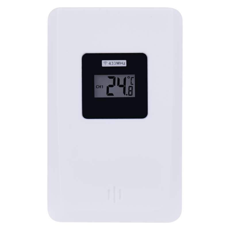 Termometr bezprzewodowy z wyświetlaniem temperatury wewnętrznej i zewnętrznej. Termometr ma czujnik bezprzewodowy o zasięgu do 30 m.