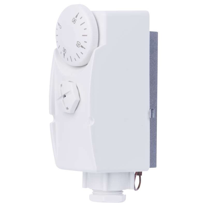 Termostat przylgowy do montażu powierzchniowego. Kontroluje temperaturę wody w zasobnikach ciepłej wody użytkowej i/albo w systemach ogrzewania. Umożliwia regulację temperatury, kontrolę ograniczeń temperatury i funkcji spadku temperatury.