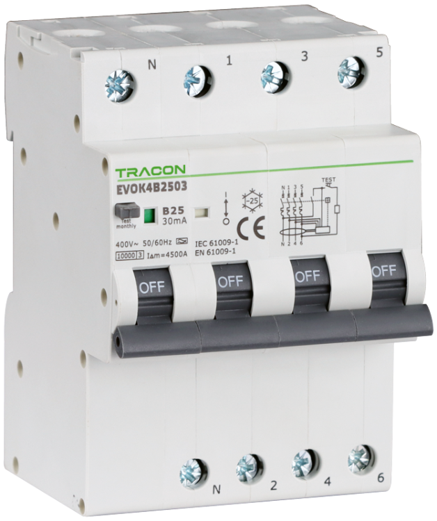 Wyłącznik różnicowo-prądowy zczł. nadprąd., B, 4P, 4-mod. B25A, 30 mA, 10kA, A EVOK4B2503 Tracon Electric