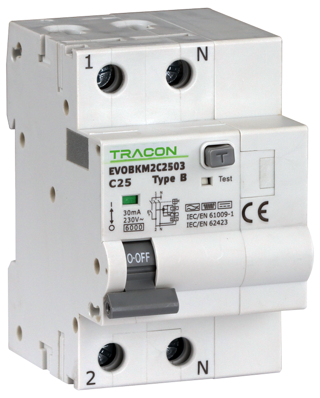 Wyłącznik różnicowoprądowy zczł. nadprąd., C, 2P, 3-mod. C20A, 30 mA, 6kA, C EVOBKM2C2003 Tracon Electric