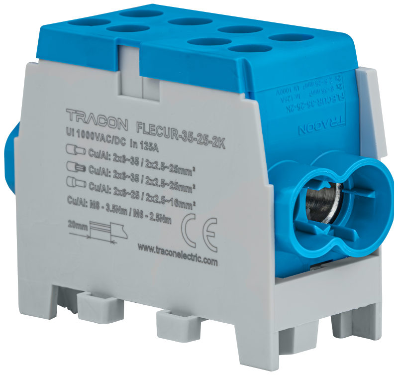 Złączka kompaktowa na szynę, niebieska (certyfik. węgierski) 6-35mm2, max. 1000VAC/DC, max.125A FLECUR-35-25-2K Tracon Electric